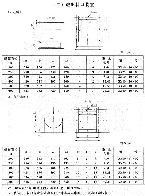 GX型螺旋機(jī)的出料口有方形出料口、手推式出料口和齒條式出樹口三種。后兩種出料口拉板的開閉方向,隨安裝不同而分右裝、左裝兩種;