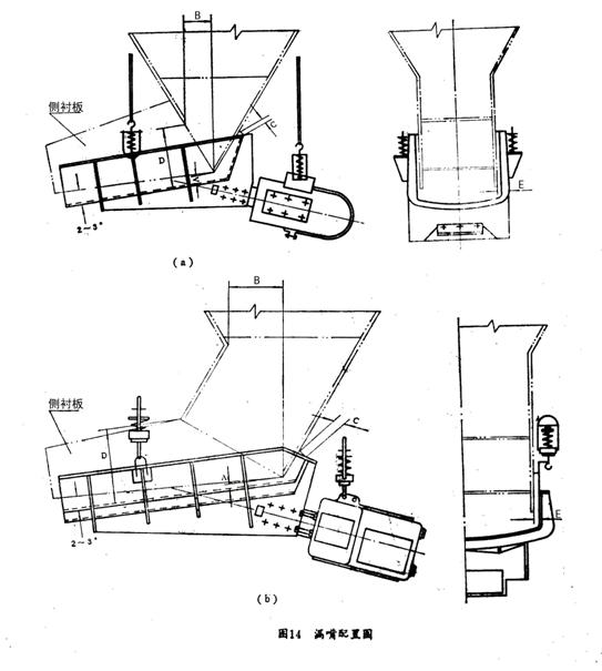 本系列電振機(jī)機(jī)設(shè)計(jì)時(shí)不考慮倉(cāng)壓影響,為保證給料機(jī)正常運(yùn)轉(zhuǎn),必須盡量減少倉(cāng)壓對(duì)給料機(jī)的影響。因此在設(shè)計(jì)漏嘴時(shí)應(yīng)用漏嘴的后側(cè)板承擔(dān)料柱的垂直壓力,漏嘴型式及配置尺寸可參考圖14及表8。
