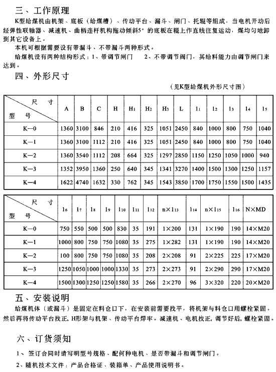 K型往復(fù)式給煤機(jī)用于煤或其它麿琢性小,粘性小的松散粒狀物料的給料里的物料連續(xù)均勻地卸蔣到運(yùn)輸設(shè)備或其它篩選設(shè)備中。